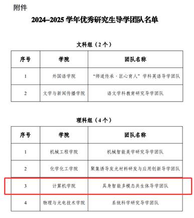 2025年,我院科研工作深入学习贯彻党的二十大、二十届三中全会精神,全面落实立德树人根本任务,以“导学思政”建设为抓手,在导学文化构建、研究生培养模式创新及学术成果转化等方面持续发力,激励全院研究生导师潜心育人、锐意进取,为学校研究生教育事业高质量发展做出了积极贡献。我院李亚峰教授担任负责人的“具身智能多模态共生体团队”被学校授予“2024-2025学年优秀研究生导学团队”荣誉称号。(文/刘月 审核/樊攀)